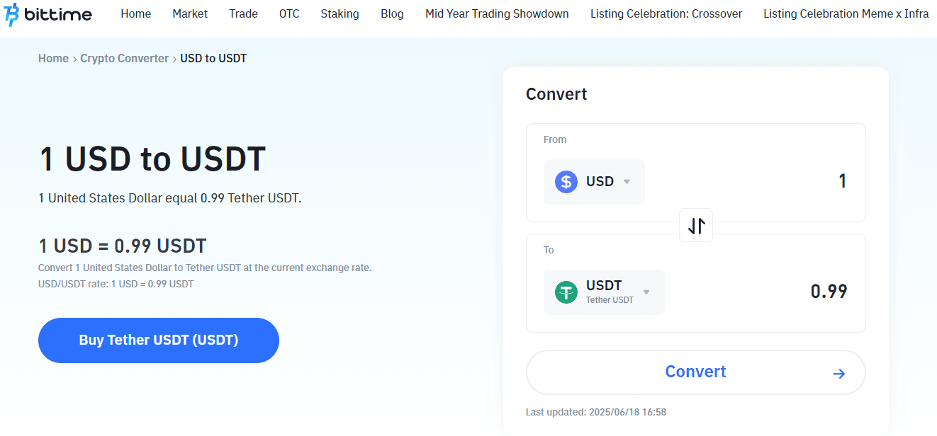 Gambar di atas menunjukkan nilai 1 USD jika kita konversikan ke USDT melalui Bittime. Pada platform tersebut nilai 1 USD sama dengan 0,99 USDT. Hal tersebut terjadi karena adanya exchange rate yang berlaku pada bursa kripto tersebut.