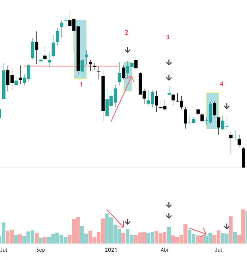 Pada gambar sebelumnya kita melihat bagaimana harga di zona maksimum dan terjadi perubahan dalam struktur harga dengan munculnya candle bearish (zona 1). Pada candle bearish ini diikuti dengan volume besar dan ini menunjukkan adanya outflow yang dilakukan oleh profesional.