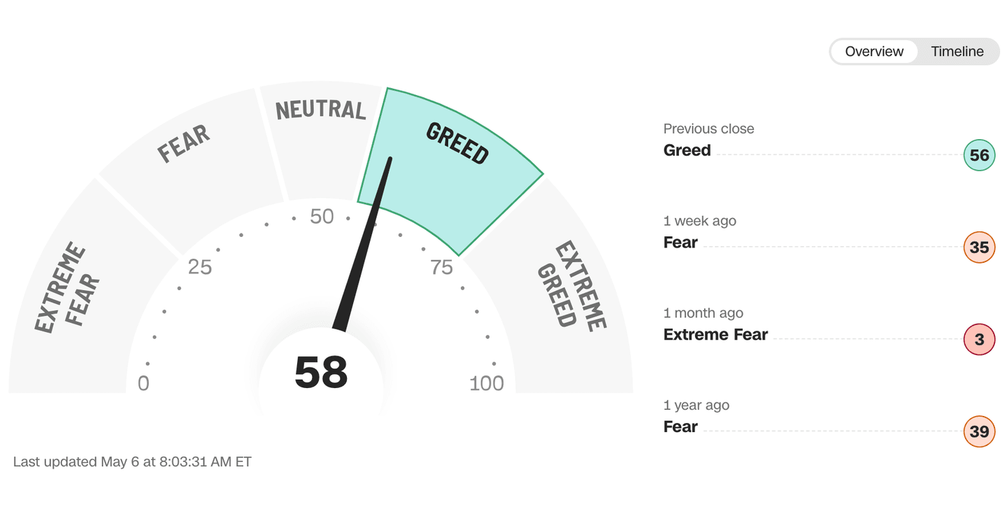 Anda harus ingat bahwa cara yang baik untuk memahami "suhu" pasar saat ini yaitu dengan menggunakan Fear and Greed Index. CNN selalu menyajikan indeks ini setiap harinya.